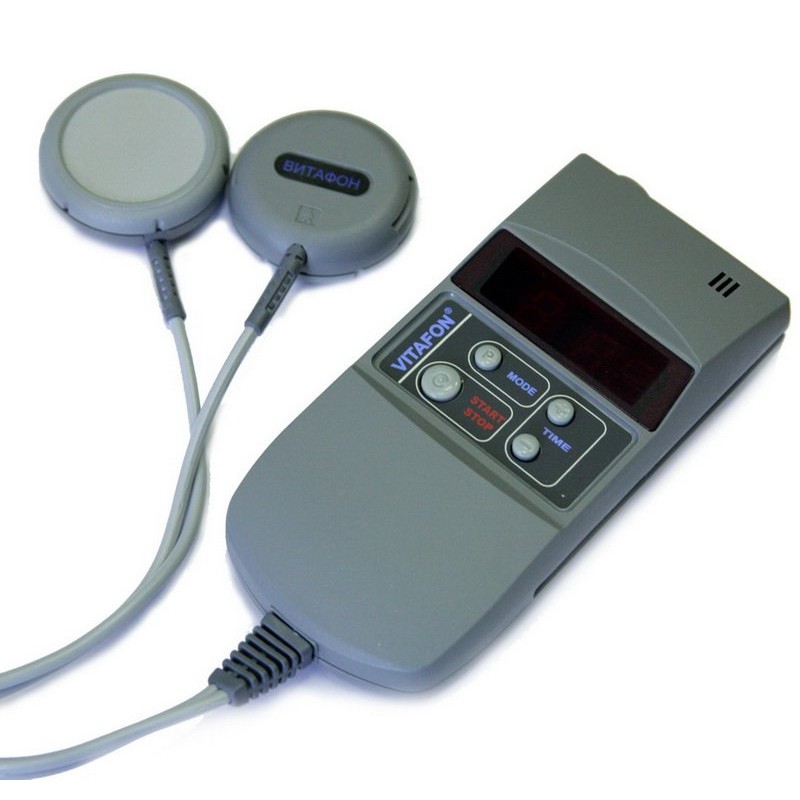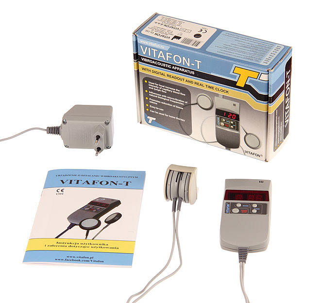 VITAFON T – wibroakustyczne urządzenie medyczne wyposażone w 2 przetworniki wibroakustyczne, tzw. wibrofony oraz cyfrowy wyświetlacz, na którym wyświetlany jest tryb i czas pracy aparatu.